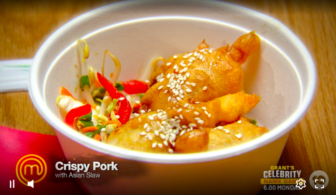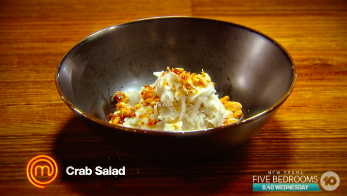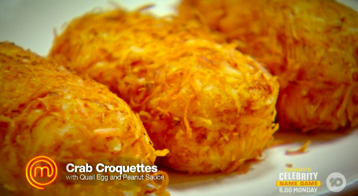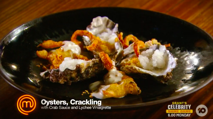 It’s a mystery box challenge today. George runs through each ingredient, and calls it the cracking box, because everything cracks. The ingredients are: coconut, quail eggs, blue swimmer crab, peanuts, oysters, lychee, pork and felons beer