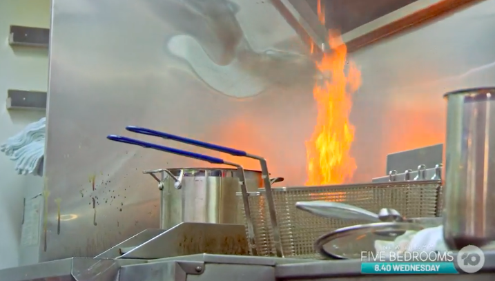 They’ve had to use a fire extinguisher, and George pretty much tells them they’re out of the running because they don’t want to risk anyone. Once the extinguisher goes off, it taints the food.