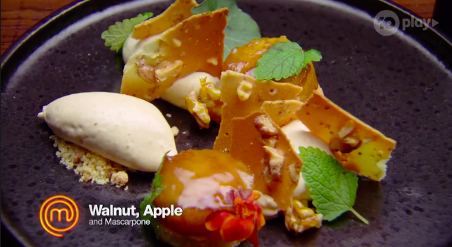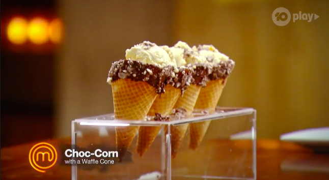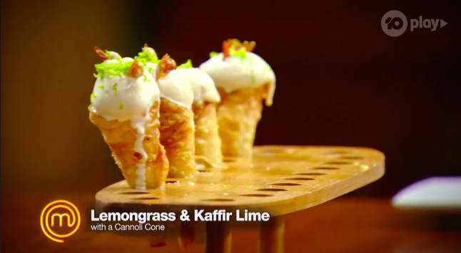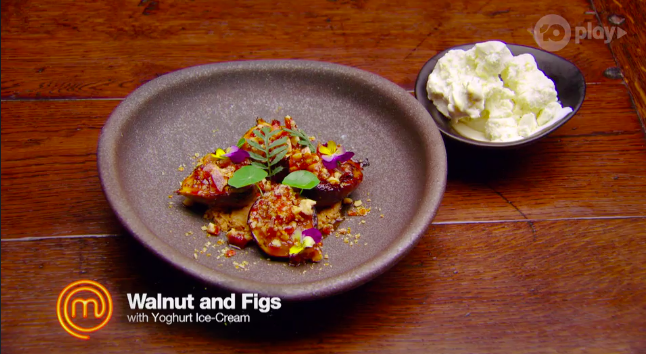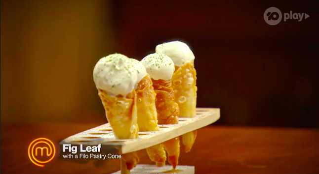Gaz says they’re not enough fig leaf. George says a fig leaf sauce would be good in it. Matt calls the cone ‘vanilla’ and Poh agrees, saying it’s a bit ‘mono’ – there’s nothing exciting going on.