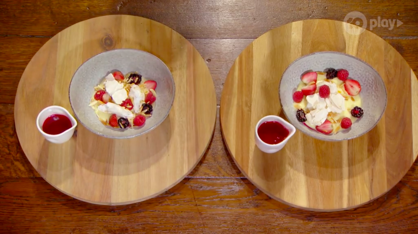 They’ve made an eton mess. This could be a mess, as it’ll be hard to make them identical. I did hear yells of, “Two strawberries,” and their co-ordinates, so maybe it’ll be ok.