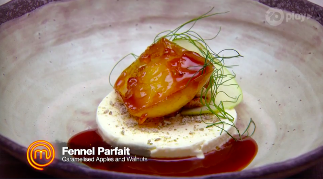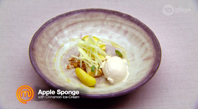 They’re getting ready for their third dish. Derek isn’t caramalising the apples for the fourth dish, but poached them in the apple cider. Gaz kinda calls him out for it and Derek’s worried. He went with his intuition, and so he’s a bit worried now.