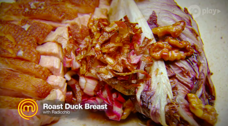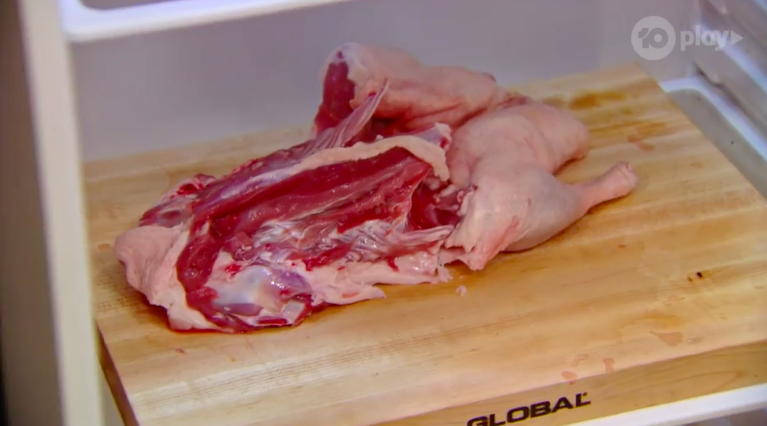 Ben grabs a duck and starts cutting it up. Upstairs, Tim says he’s already worried, because duck is a bit of a luxury item and he doesn’t think it fits the theme.