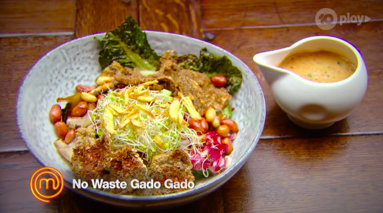 Wheeling out a table, George tells them what they’re cooking. This is the most thrown out foods in Australia. They’ve got milk right on the edge of use by, bananas in all stages, bread that’s getting to stale, and lettuce that’s wilting.