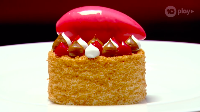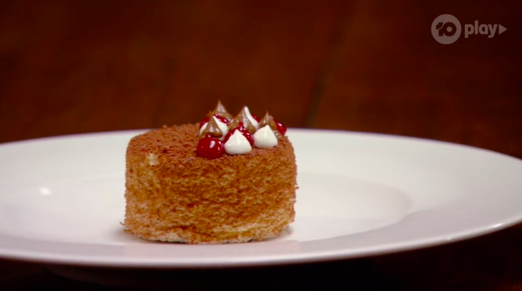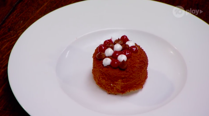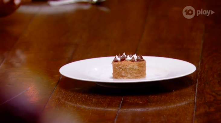 He reveals the dish. This dessert is possibly the fanciest version of a lamington.