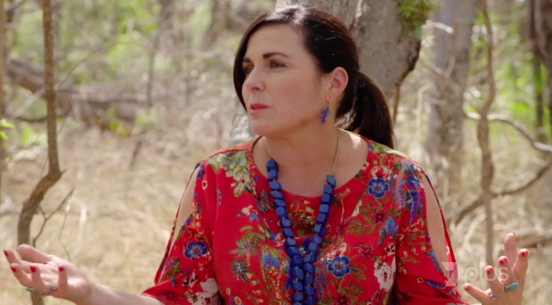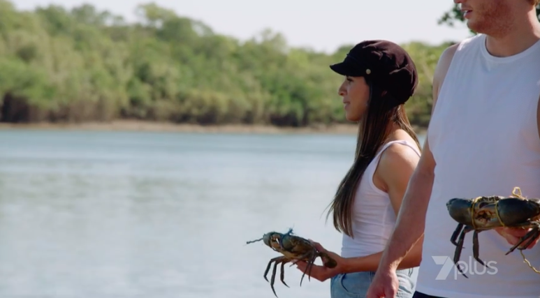 Neesh and Lachlan go to get some food for a group dinner tonight. They go to a water area, idk, and see Tommy, their outback guide. He has caught them some crabs, and Neesh helps wrap ’em up.