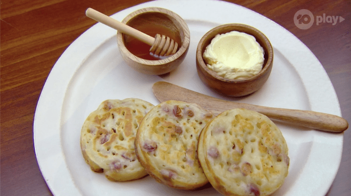 Bun burns the bottom of his crumpets and they’re yuck. He’s ruined two batches of crumpet but decides to go with the first batch as the burnt flavour will go all the way through.