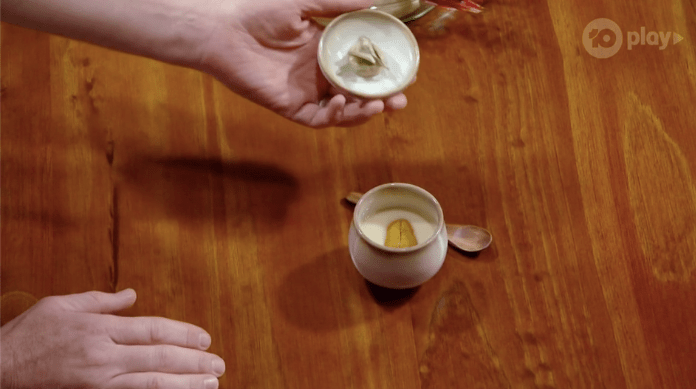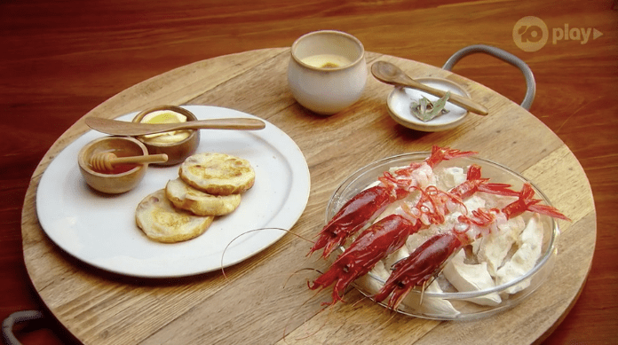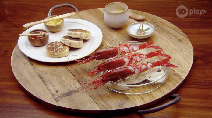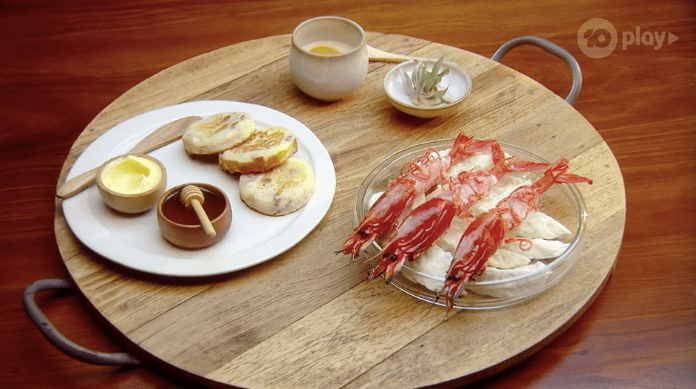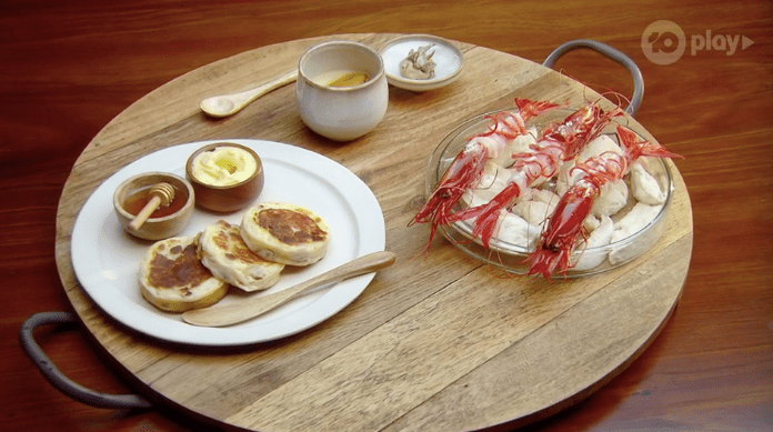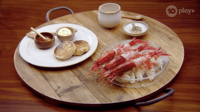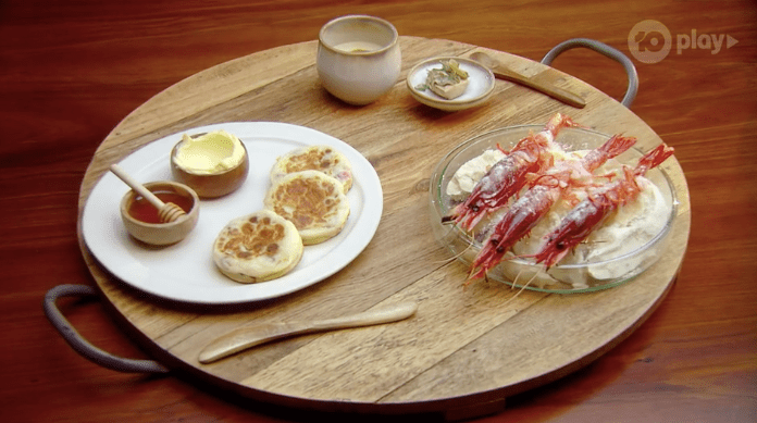 Jock brings the eight over to talk about it all and get them to eat it. I’m going to be honest, I have no idea what this dish actually is? I don’t know what anything is, except the last thing is a crumpet with honey and butter, and the first is like scarlet prawns or something?