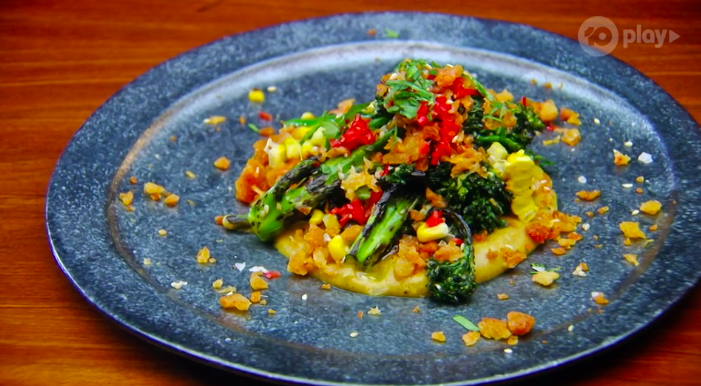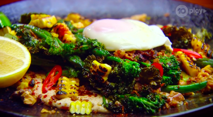 Finally, he BBQ’s himself a steak with like, I don’t know, broccolini with ancovies and oil.