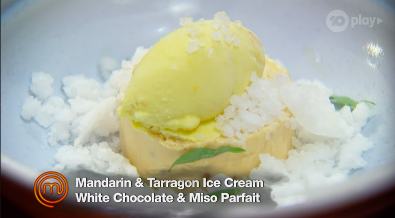 It’s Reece next with a Mandarin and Tarragon Ice Cream and White Chocolate and Miso Parfait.