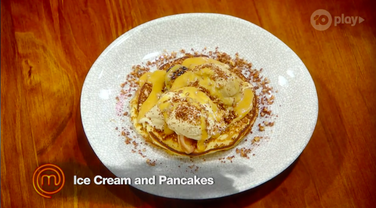 Next is Simon, who’s disappointed with how it’s gone. It’s molasses and peach ice cream with pancakes.