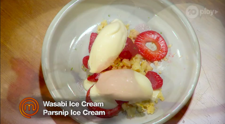 Brendon next with wasabi and parsnip ice creams. Mel says it’s something to go back to the drawing board with.