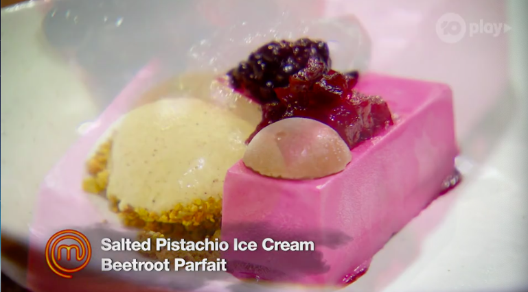 Up with beetroot parfait and salted pistachio ice cream is Callum.