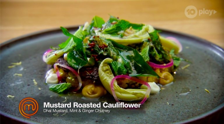First is Callum, who went with mustard and mint – Mustard Roasted Cauliflower with Dhal Mustard, Mint and Ginger Chutney.