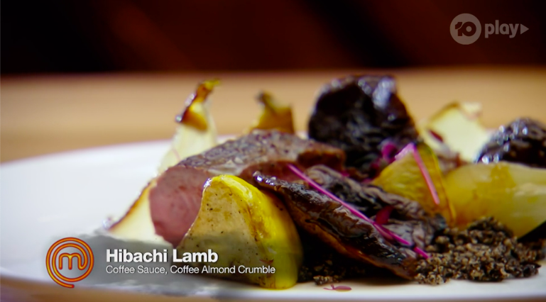 Next up is Simon who did lamb and coffee. His dish is Hibachi Lamb with Coffee Sauce, Coffee Almond Crumble.