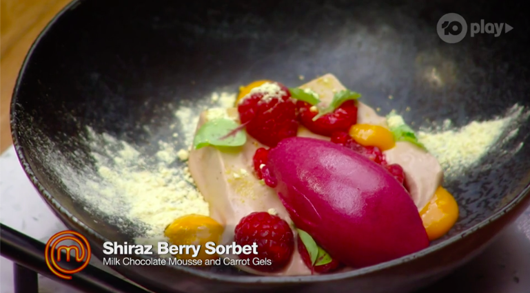 Finally, Jess, with Shiraz Berry Sorbet with Milk Chocolate Mousse and Carrot Gels, for the carrot and raspberry combo.