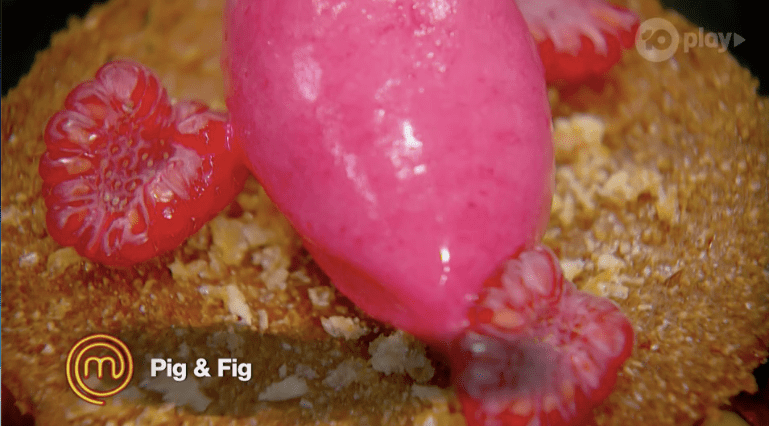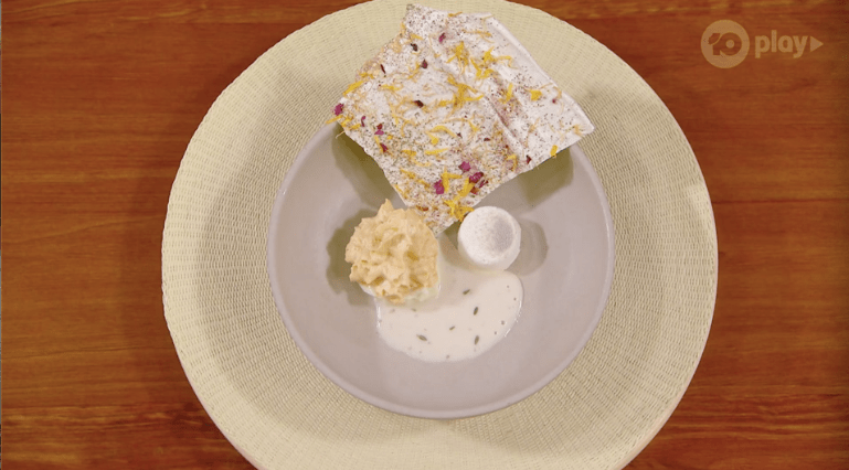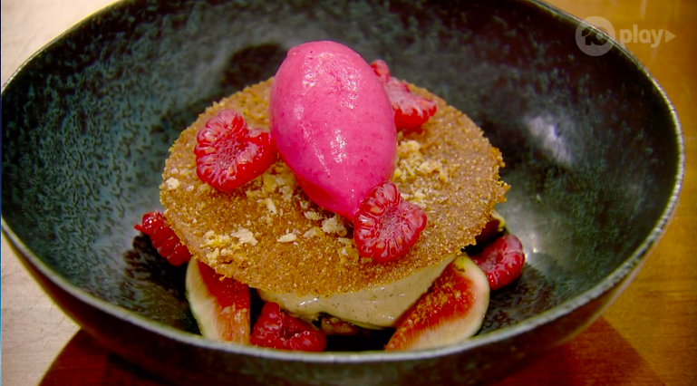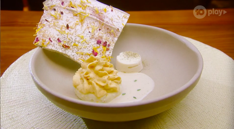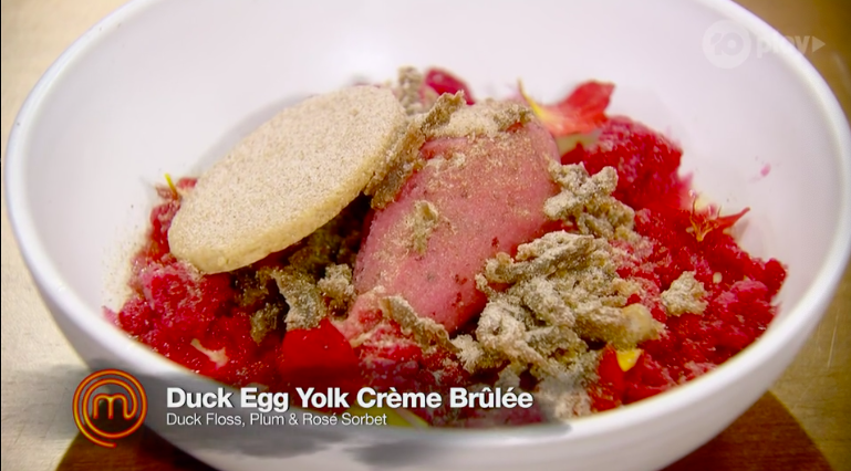 Reece is up with his Duck Egg Yolk Crème Brûlée with Duck Floss, Plum and Rosé Sorbet.