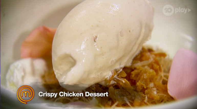 They have to guess ingredients, before being told the main ingredient is chicken. Um, wait isn’t Reece vegan??? Did they make him eat this?? I have so many questions. Ok, if you know, PLEASE let me know, because surely they’d have to tell him, or make a vega option or something??