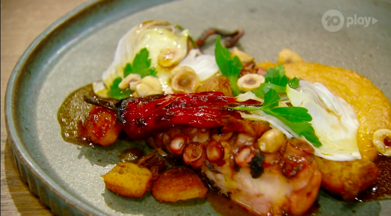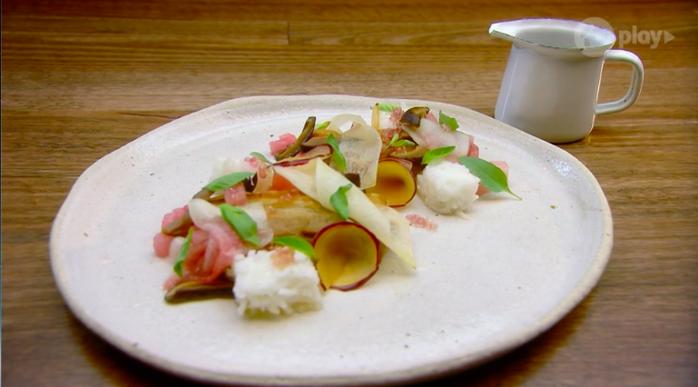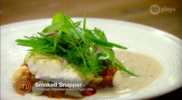 Next is Tessa with Smoked Snapper with Tomatoes, Macadamia and Finger Lime. She was worried it was over, however it was cooked perfectly. Mel and Andy liked it, however Jock had a few issues with it, and he wasn’t the biggest fan, saying the sauce was too heavy and didn’t complement the fish.