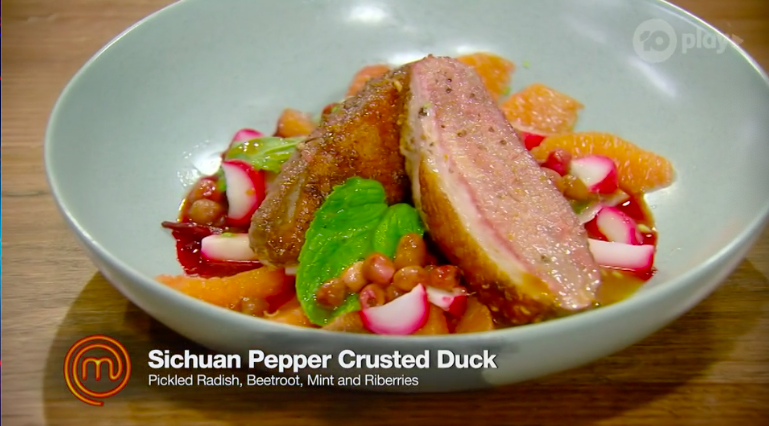 Poh’s up, bringing Sichuan Pepper Crusted Duck and Pickled Radish, Beetroot, Mind and Riberries.