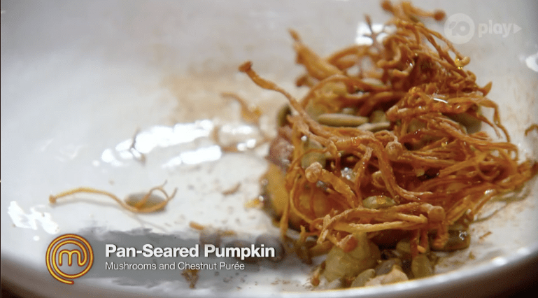 They taste Reeces dish first, Pan-Seared Pumpkin with Mushrooms and Chestnut Purée.
