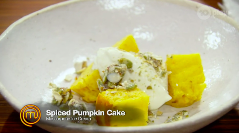 Finally is Reece, serving Spiced Pumpkin Cake with Mascarpone Ice Cream.