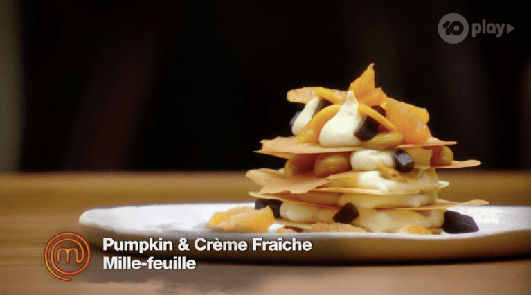 First to taste is Emelia. She brings up a Pumpkin and Crème Fraîche Mille-feuille.