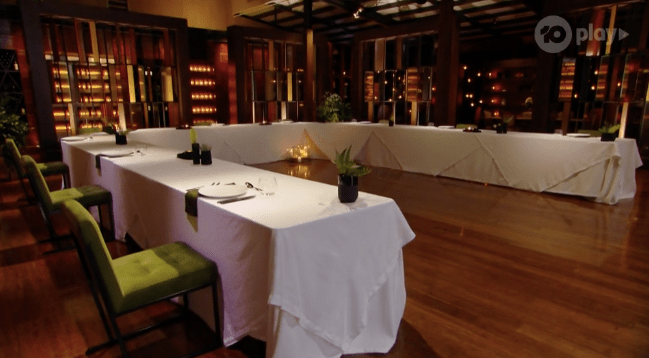 The contestants come in to find the judges standing in front of a big dining table, and the benches set up for service.