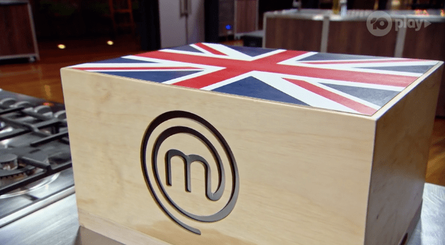 The contestants come in to see a Mystery Box with the Union Jack stuck on top.