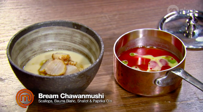 Bream Chawanmushi with Scallops, Beurre Blanc, Shallot and Paprika Oils