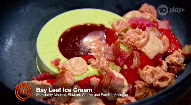 Jock and Andy come over to grill him about the bay leaf ice-cream. The judges taste it, and keep tasting all the elements, like rhubarb and paprika meringue.